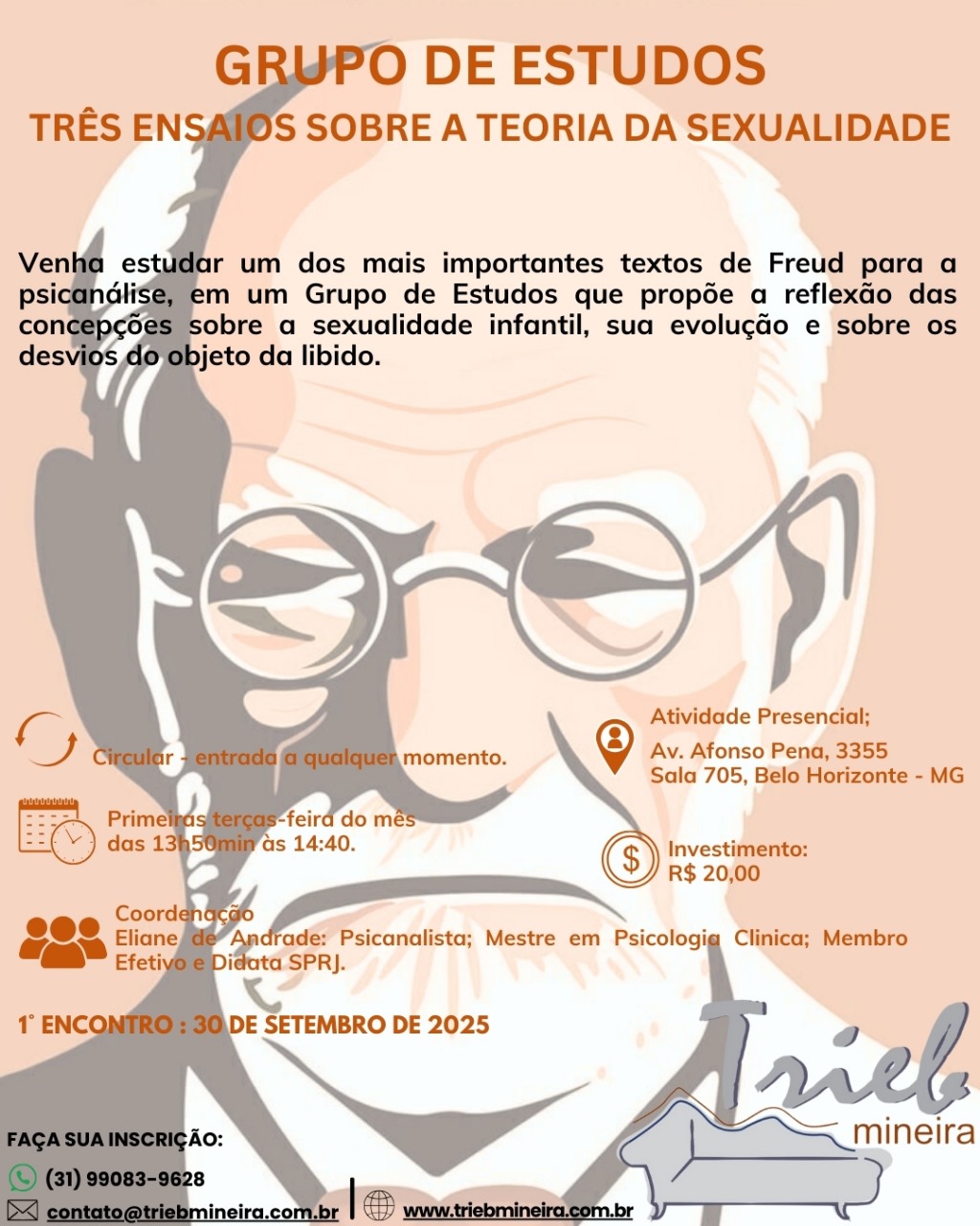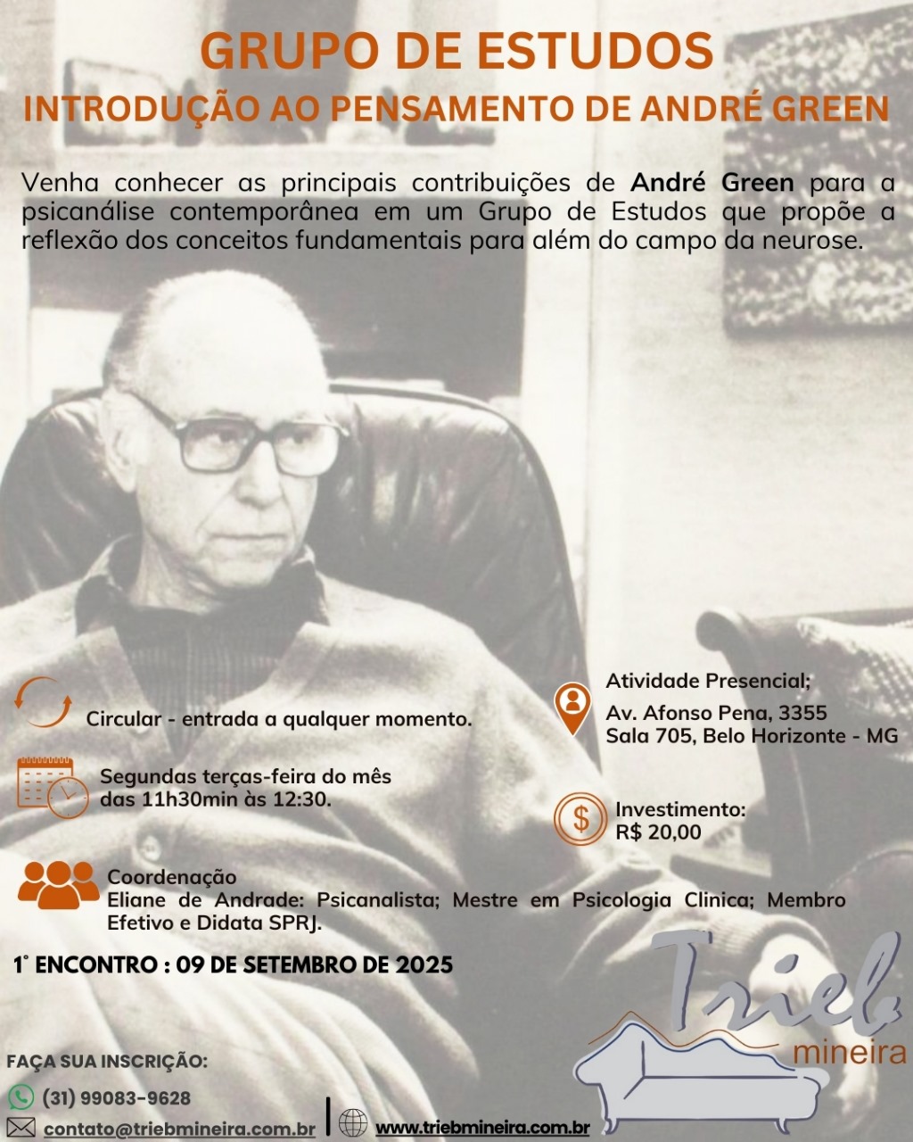 Grupo de estudos sobre conceitos fundamentais da obra de André Green. Ocorrerá às segundas terças-feira do mês, de 11h30 às 12h30, na sede da Trieb Mineira.